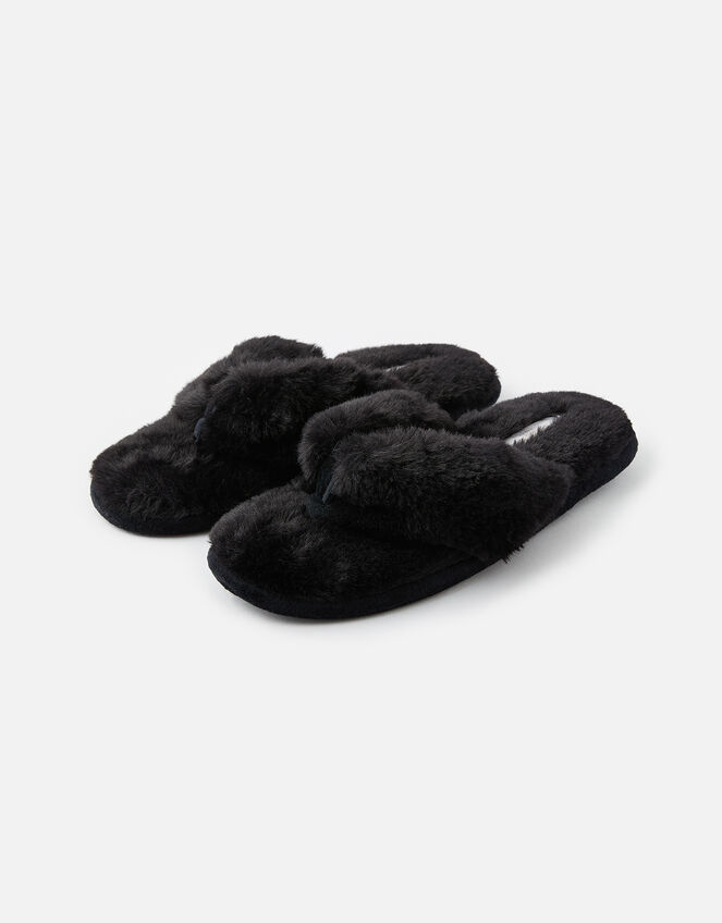 Cosy feet - check! Our Laura slippers have a fluffy faux fur upper with a toe-post strap. They're also textured at the sole to help prevent slipping. Black