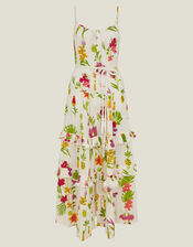 Beautiful in botanicals, this sun dress is best paired with your favourite straw hat and drink in hand. Printed with vibrant florals over the floaty silhouette, finished with ruffle detailing and a tie belt to the waist. White