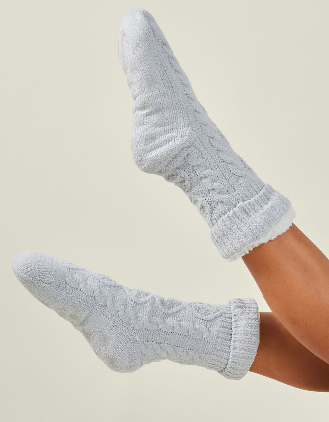 Make weekends spent at home extra cosy when jumping into these slipper socks. Designed in luxuriously soft cable chenille, these socks are finished with fluffy borg trims for comfort and anti-slip pads for safety. Grey