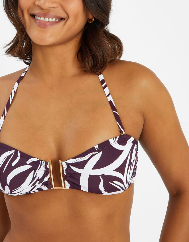 Designed with an abstract flower pattern, this bikini top features U-shape gold hardware at the centre with halterneck tie straps. Matching bottoms available. Brown