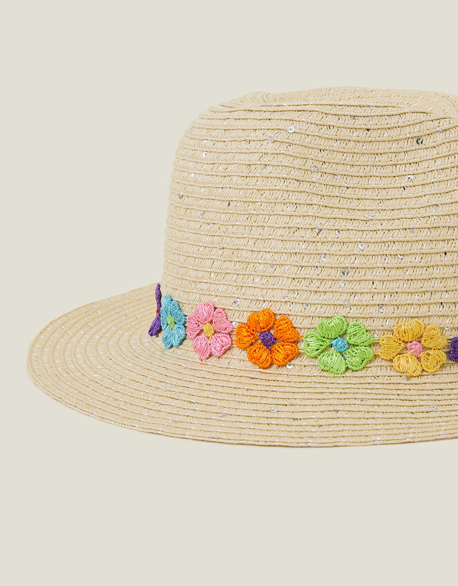 We've put a whole bunch of summer fun into this piece! This sparkly trilby hat is woven with sturdy straw that keeps its classic shape, whilst the colourful flower details bring all the fun. Natural
