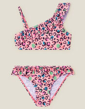 This wildly cute bikini set is the perfect option for endless trips down the waterslide. Finished with a colourful leopard print on a pink backdrop, this set comprises a one-shoulder crop top with ruffle detailing and matching bottoms. Multi