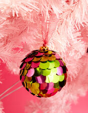 Beautifully hand-embellished, this bauble is coated in sequins for a twinkly touch to your tree. Available in gold, silver and multicoloured designs, just imagine it next to the tree lights! Hangs on sturdy string. Pink