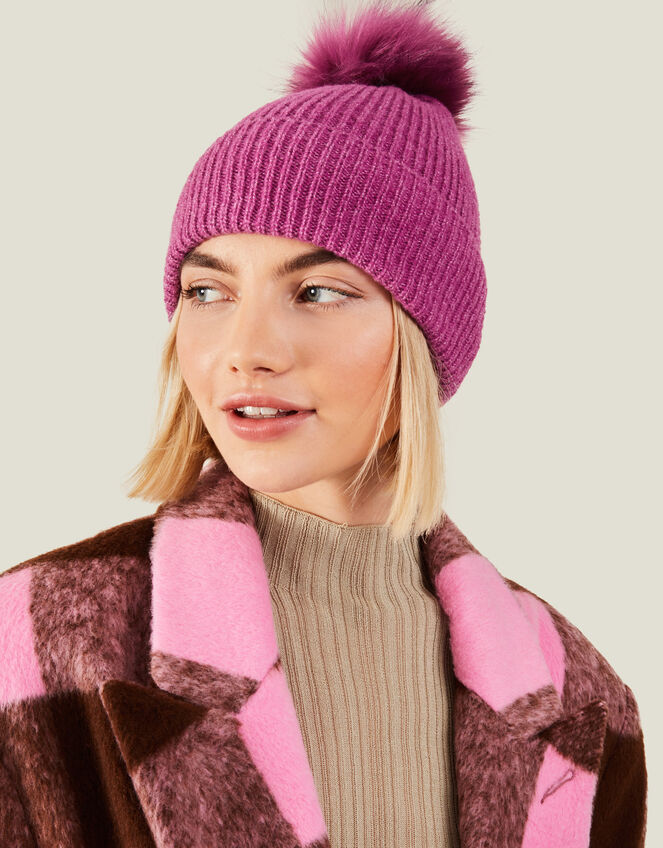 Only complete with a hot drink in hand, this knit beanie hat features a faux fur pom-pom and turned up brim. Purple