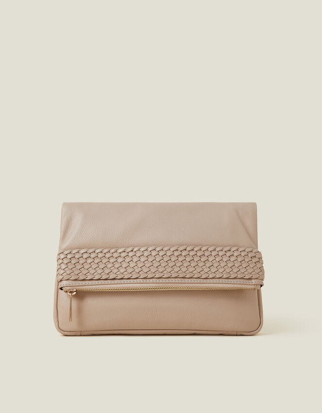 Soft, supple, and plenty of room for all your essentials, this leather clutch bag boasts a slouchy profile with woven detailing and a zip fastening to the top. Nude