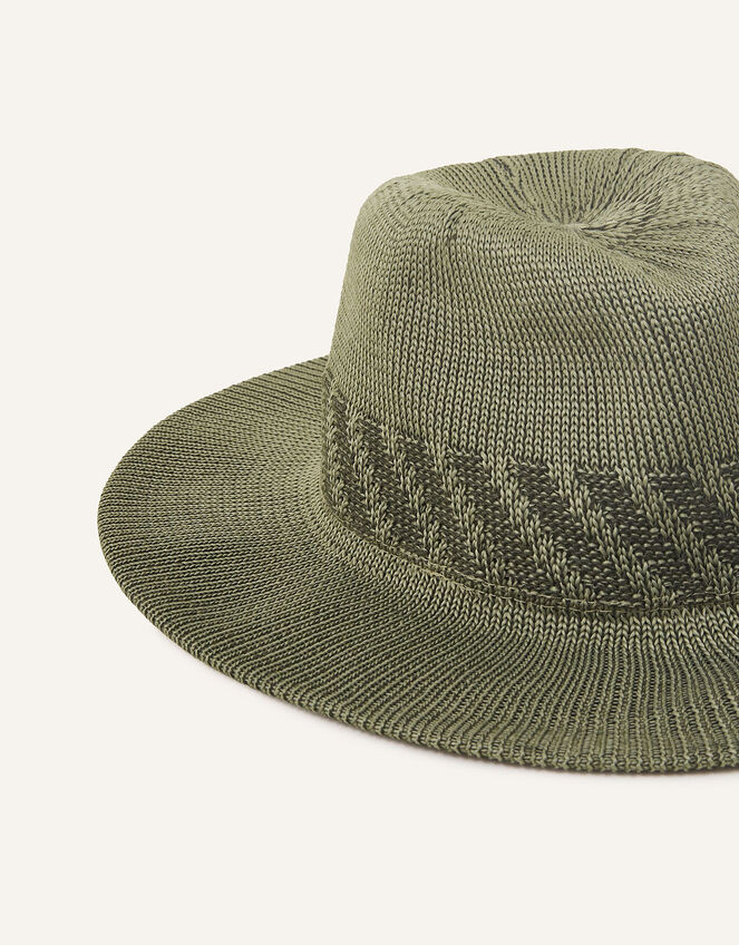 Tightly woven, this flexible fedora can be softly squashed down to pack easily into your tote bag. Finished with a dipped crown, wide brim and striped weave band. Green