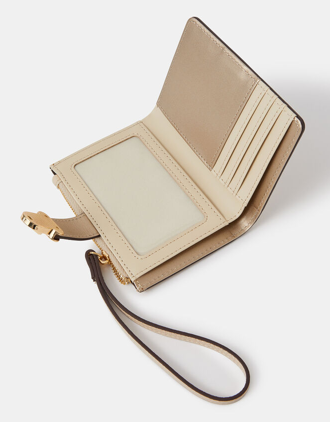 Designed with a gold metallic finish, this purse features a secure push-lock fastening and wrist strap attached to the zip compartment. Open to find a clear pocket for ID or cute photos and four card slots.