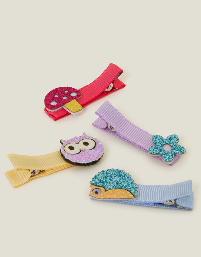 Hosted in an array of colours, these fabric-covered hair clips feature sparkly woodland motifs including a mushroom, flower, owl and hedgehog. Four included.