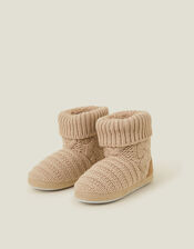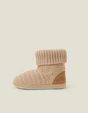 Reasons why we love cold weather: these slippers. Stitched with a chunky cable knit design, these boots are lined with snuggly fleece for extra comfort. Camel
