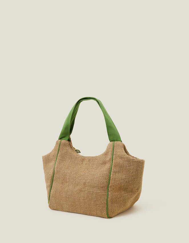 Introducing, the ultimate summer bag. Designed in jute, it features green contrast straps and piping with a relaxed profile. Finished with a detachable floral tassel and magnetic closure.