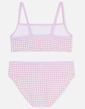 Designed with a super summery floral gingham print, this bikini features a comfy crop top and brief cut bottoms. Perfect for sunny afternoons spent running through the garden sprinkler. Purple