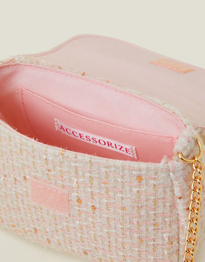An accessory that looks like it's come straight out the Clueless movie. Cloaked in preppy pink tweed, this bag features a gold heart-shaped twist lock fastening and a chain strap detail to match.