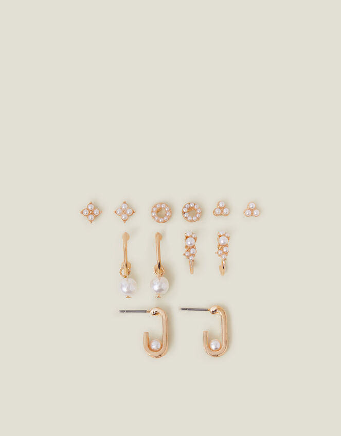 Gold-tones and pretty pearls combine to create a timelessly classic set. Each pair boasts a unique design, featuring huggie hoops and studs - perfect for mixing and matching! Six pair included.