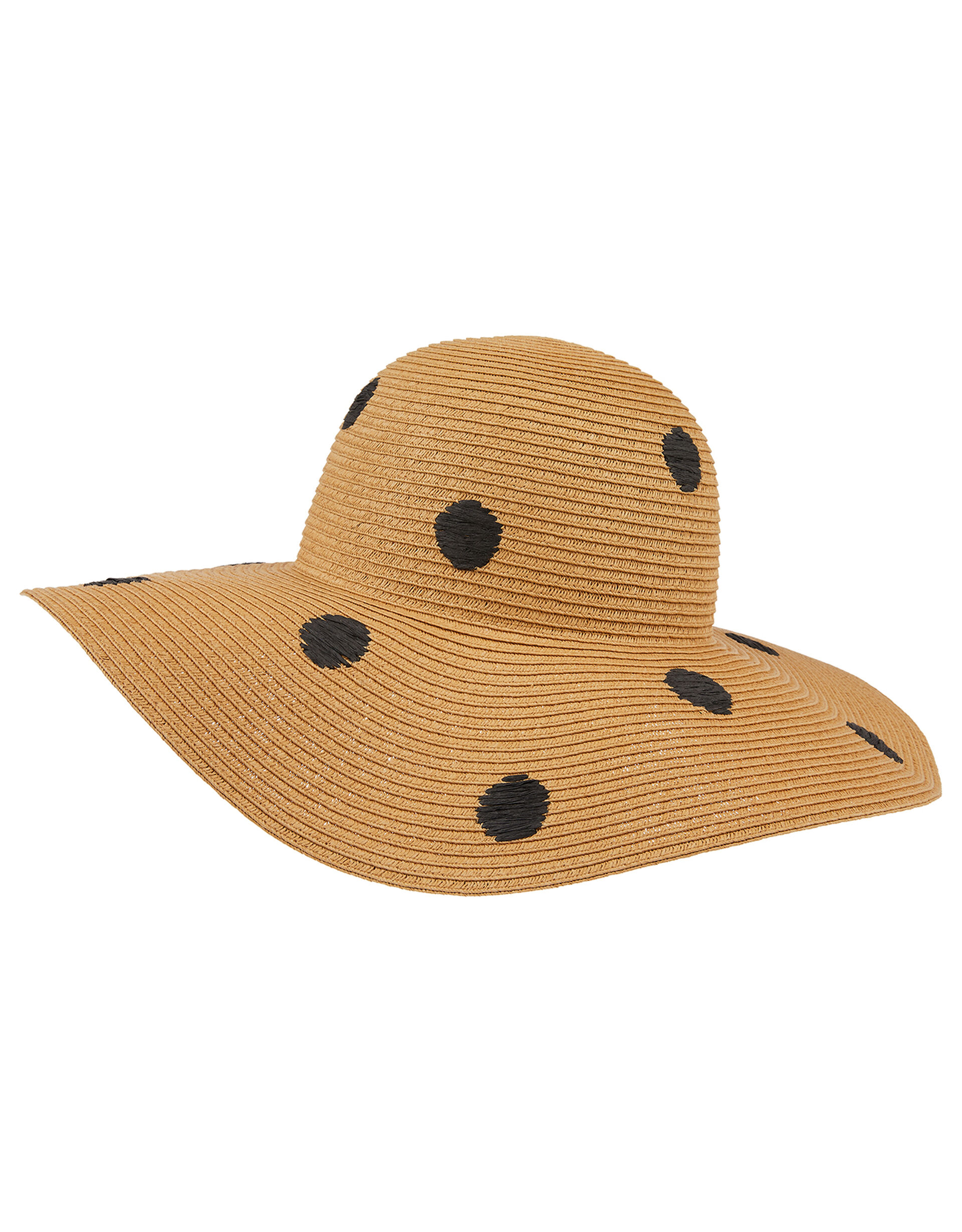 An effortless finishing touch for your holiday wardrobe, this wide-brim floppy hat features a simple, easy-to-style weave with a polka dot pattern.
