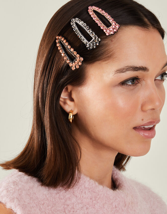 Dazzle for days with these hair clips. Featuring three clips, each piece is encrusted with uniquely coloured gems, including pink, silver, and rose gold.