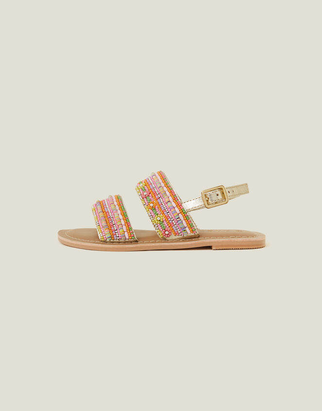 A suitable pair for sunny days with a salty sea breeze, these sandals feature a double strap design topped in beaded embellishments. Made in faux leather, they fasten around the back of the foot with a pin-buckle. Multi