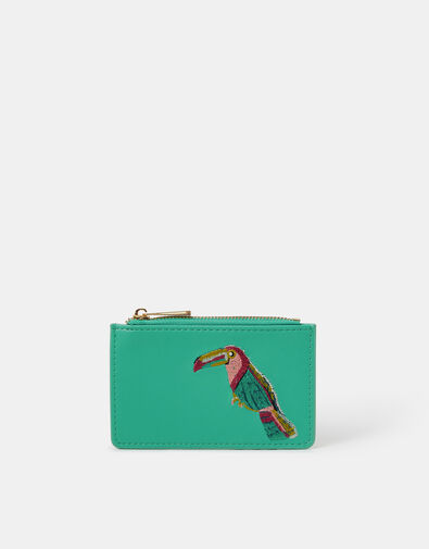 Is there a parrot in the room? Embroidered with a colourful parrot on a teal backdrop, this coin purse fastens with a zip closure to the top.