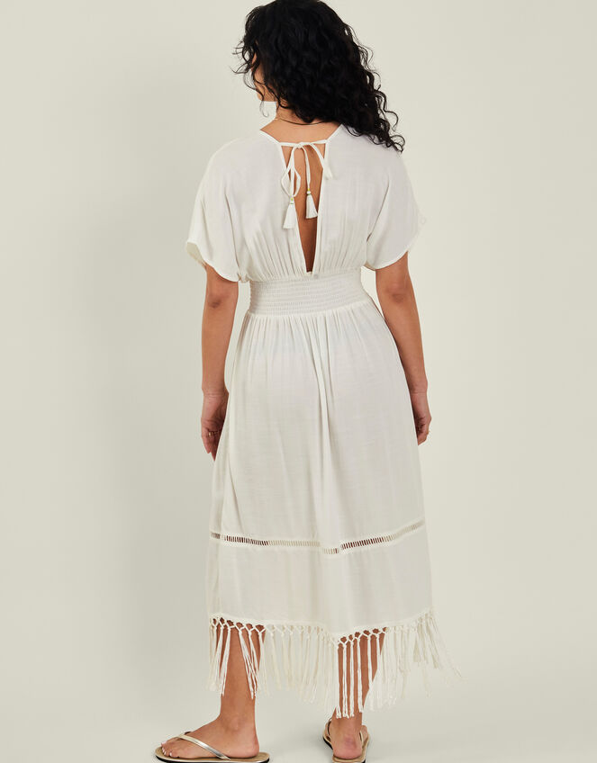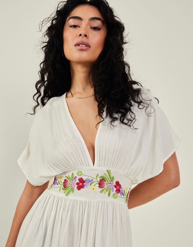 Sun, sand, this kaftan. Throw on and go, but keep it chic with this kaftan, embroidered with florals on the waist that pop on the semi-sheer ivory backdrop. The drape sleeves and flowing midi skirt bring an oh-so-breezy feel, with embroidery and tassels for a boho finish. Ivory