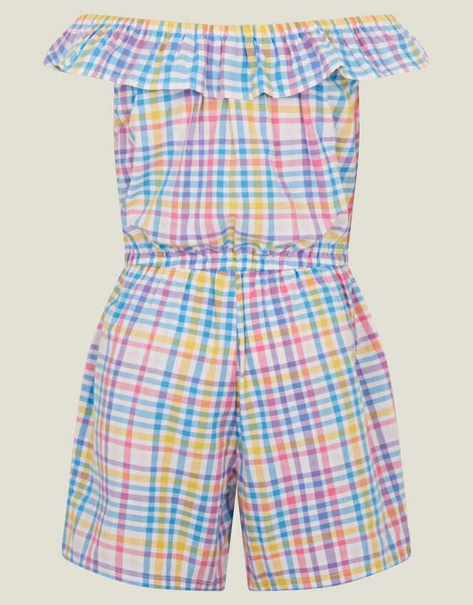 Perfect for park picnics and summer holidays. This off-the-shoulder playsuit is decorated with colourful checks, daisy embroidery and frills to finish. Multi