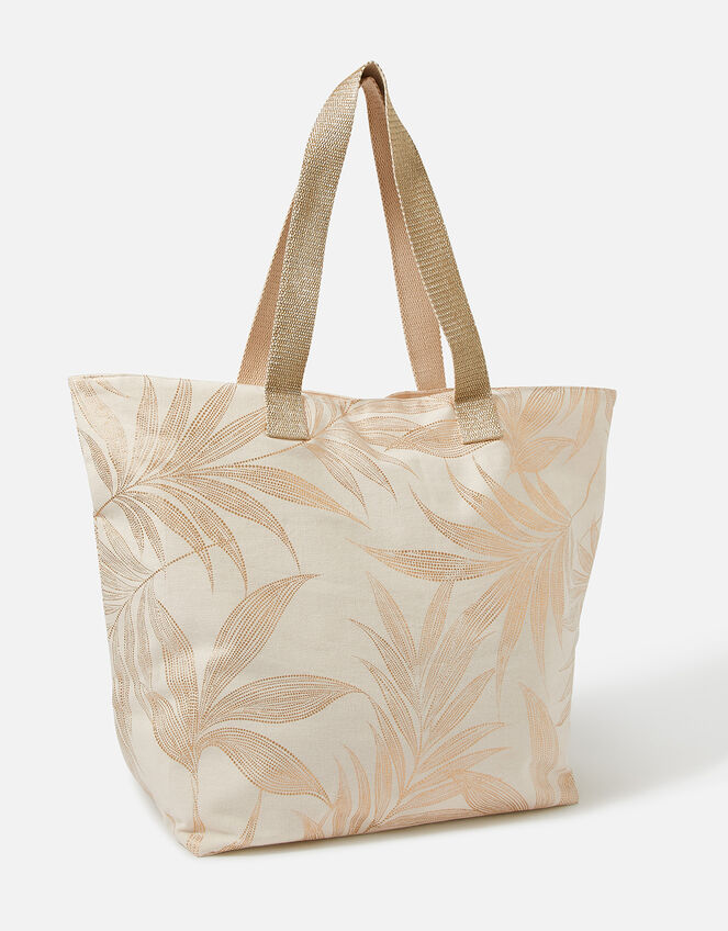 The metallic detailing on this large tote bag will shine beautifully under the summer sun. Destined for sandy shores, it offers plenty of room for sunnies, a good book, and sunscreen. Fastens with a zip. Natural
