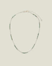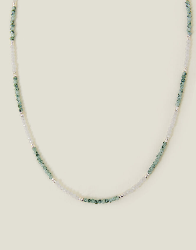 Strung with a mix of white and green beads with unique finishes, this necklace adds a touch of boho charm to your everyday look. Dipped in sterling silver for a sparkling finish.