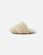 These slippers feature a wide fur band to the top, in a classic mule profile. Camel